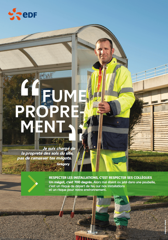Les premières personnes à avoir affaire à ces mégots de cigarettes sont ceux qui les ramassent ; à la CNPE, ce sont les travailleurs des ateliers espaces verts de l’ESAT de Braud et Saint-Louis. Afin de sensibiliser les salariés de la CNPE du Blayais, deux de ces travailleurs ont posé pour une campagne d’affichage interne de la centrale.
