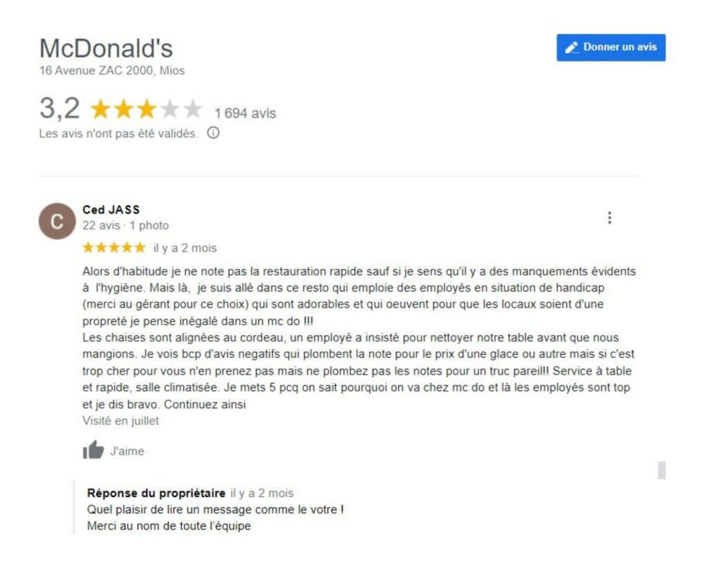 Le témoignage le plus objectif de cette réussite réside probablement dans les commentaires des clients et nous ne résistons pas à l’envie de vous partager un avis déposé il y a deux mois sur la page Google du restaurant de Mios !
