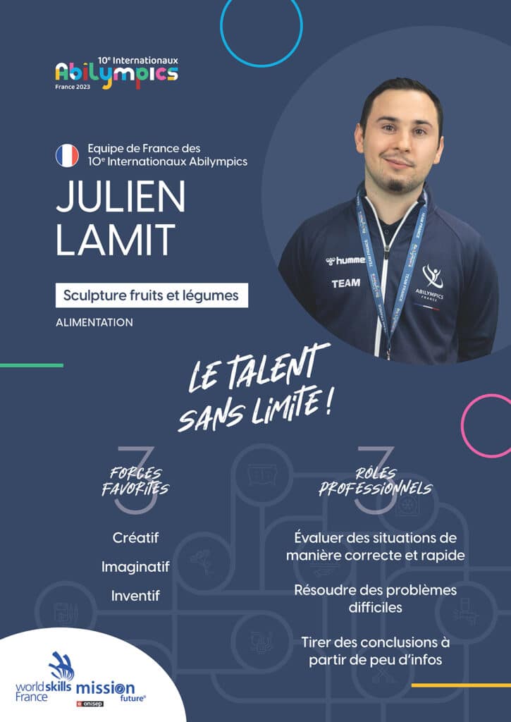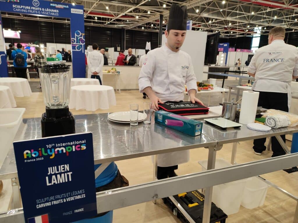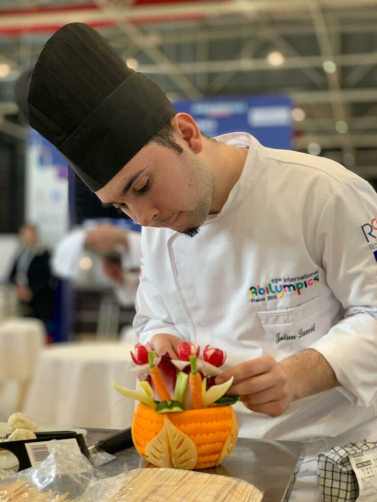 En 2021, Julien participe à Inculsive Skills Europe. Sa victoire le sélectionne pour les Olympiades des métiers en 2022, où il concourt à l’épreuve Cuisine en totale inclusion parmi des étudiants. Sa prestation remarquée aux Olympiades des métiers a conduit Abilympics France à le sélectionner en Equipe de France pour l’épreuve Sculpture fruits et légumes. Julien est un dessinateur chevronné, passionné de tout ce qui se rapproche de l’artistique, cette sélection est donc pour lui une formidable opportunité pour exprimer toute sa créativité.