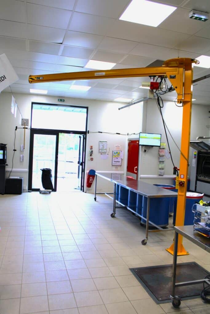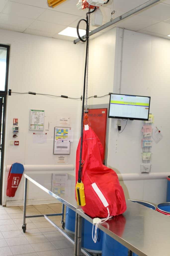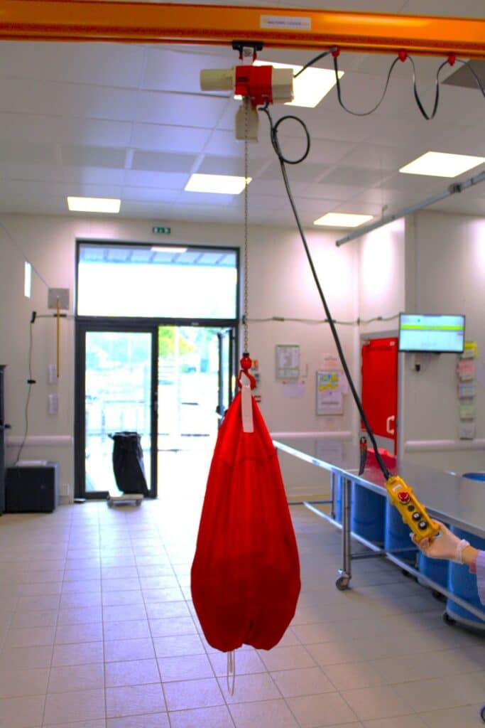 – Mise en place d’un palan pour lever et déplacer les charges lourdes du sol à la table de tri. Cela permettra de réduire les Troubles musculosquelettiques (TMS) ou accidents de travail, en évitant de porter à la main les linges lourds. Le nouveau palan rendre également accessible la tâche à un grand nombre de personne, car plus besoin d’une certaine force physique pour déplacer les charges.