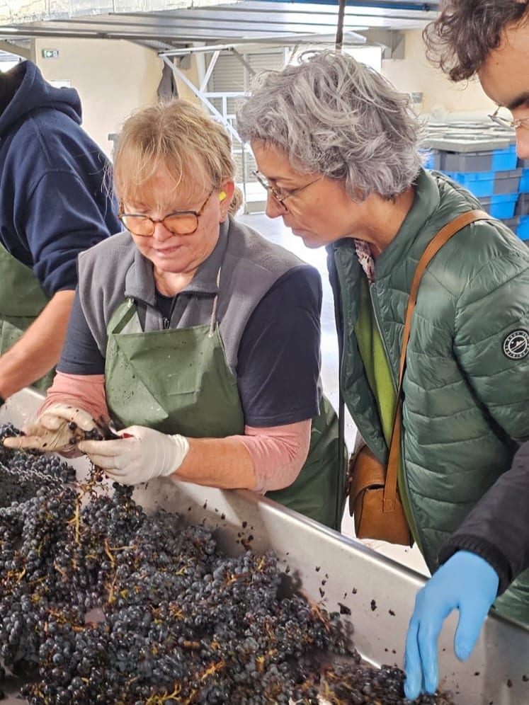 C’est ainsi que le projet a vu le jour le 9 octobre. Six travailleurs de l’ESAT, accompagnés d’Anne et Jean-Louis, deux professionnels de l’atelier restauration, se sont rendus au Château Pichon Baron à Pauillac pour participer à une journée de vendanges. Au programme : tri manuel des raisins, découverte du processus des vendanges, visite de la propriété et un repas convivial partagé avec les professionnels de la Compagnie Médocaine des Grands Crus et les équipes du Château